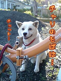 ポストまでチャリで行きま~す…花の前では笑顔だったレオもチャリ前では顔が強張る。