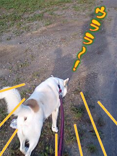 さ~チャリ散歩!発進!この時間、散歩するのにいい気温なので、他のワンコも散歩してました。同じ歩道上には居なかったけど、向かい側歩道で散歩するのを見るたび、レオのスピードは上がります
