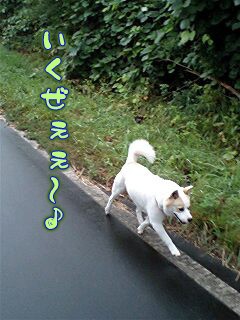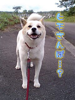 本日は二十日お盆ということで、墓地道路にはまた車が通ります。ヒモ散歩でございます。ちょいと不服のご様子。