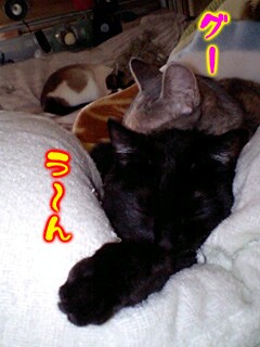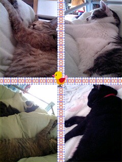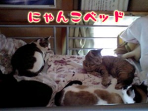 連休、ニャンタ君は我が家にお泊まり。3匹が先にベッドで寝ていたので、ニャンタを入れてみた。