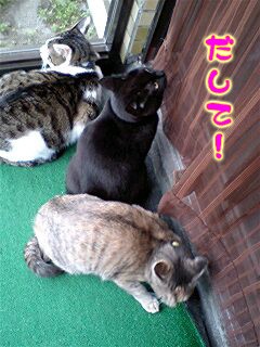 この日はお祭り。クロ・ゼット・ニャンタに神輿を見せようと玄関フードに閉じ込めた。案の定、怖がる猫達…レオも外にいたからね。そこへ神輿やら太鼓が来て騒がしくなってきた。ふと玄関フードを見たら…目隠しカーテンが外れてた。猫達は戸をこじ開けて家の中に逃げ込んでました~怖かったんだね。