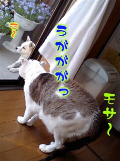 本日のチャリ散歩での、ばーちゃんチの猫「ニャオ君」とレオ。
