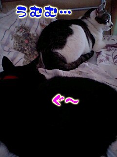 連休、ニャンタ君は我が家にお泊まり。3匹が先にベッドで寝ていたので、ニャンタを入れてみた。